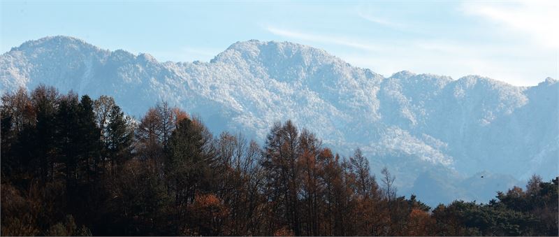 설산으로 얼굴을 바꾼 드높은 지리산과 늦가을 단풍이 물든 함양군 마천면 축동마을 야산 모습. 늦가을과 한겨울이 공존하는 시간이다.