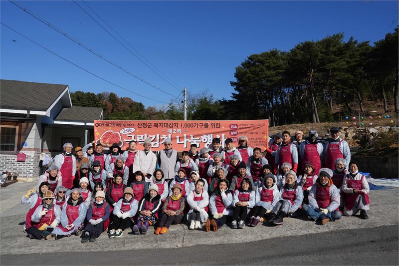 송덕사 김장김치 나눔 행사에 참여한 자원봉사자들이 단체 기념사진을 찍고 있다. 이상 산청군 제공