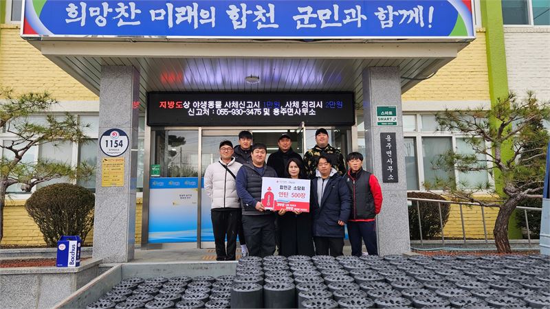 합천이 고향인 지역 선후배 청년 8명으로 구성된 친목모임 소담회 회원들이 연탄 배달에 앞서 용주면사무소 앞에서 기념사진을 찍고 있다. 이상 함양군 제공