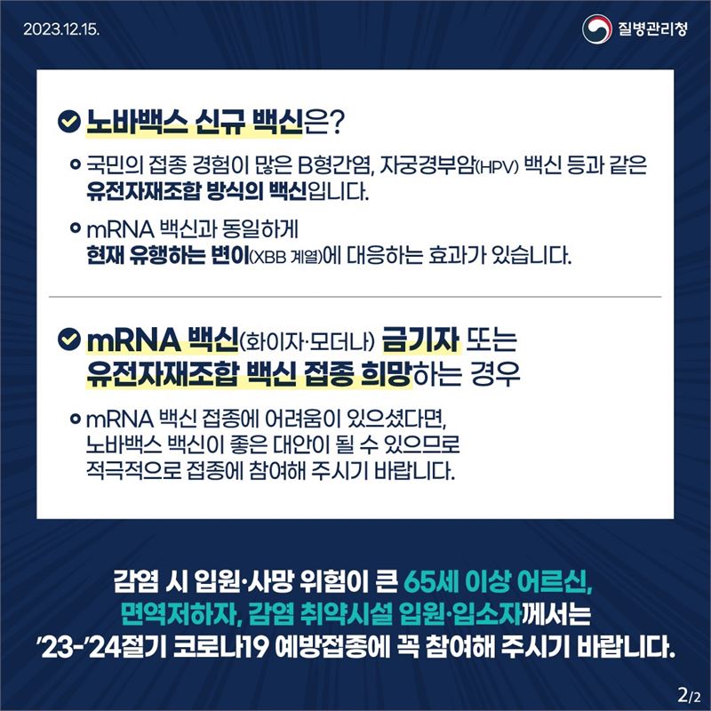 노바백스 백신은 ▲B형간염 백신, 자궁경부암 백신 등 국민의 접종 경험이 많은 유전자재조합 방식의 합성항원 백신이다. ▲mRNA 백신과 동일한 변이(XBB 계열)에 대응한다.