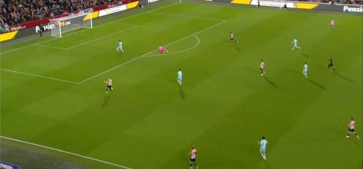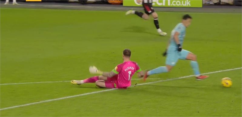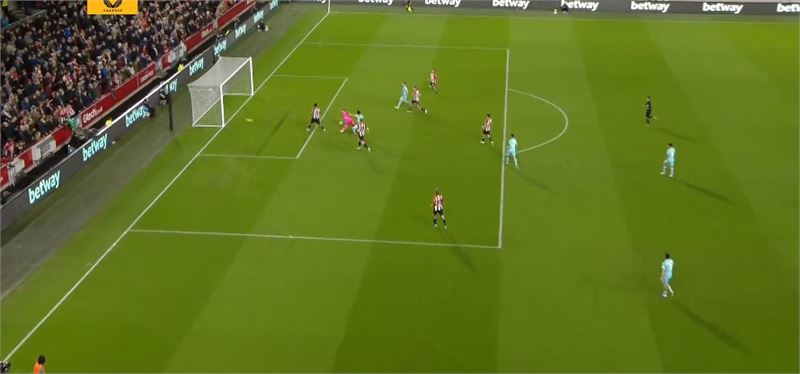 리그 9호골을 넣은 황희찬이 세리머리를 하기 위해 관중 쪽으로 달려가는 모습. 브렌트퍼드 골키퍼가 망연자실해 하고 있다.
