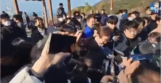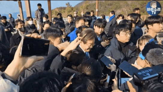 이재명 민주당 대표가 2일 부산 가덕도 신공항부지 방문 중 피습 당한 순간. 유튜브 바른소리TV. 독자 제공