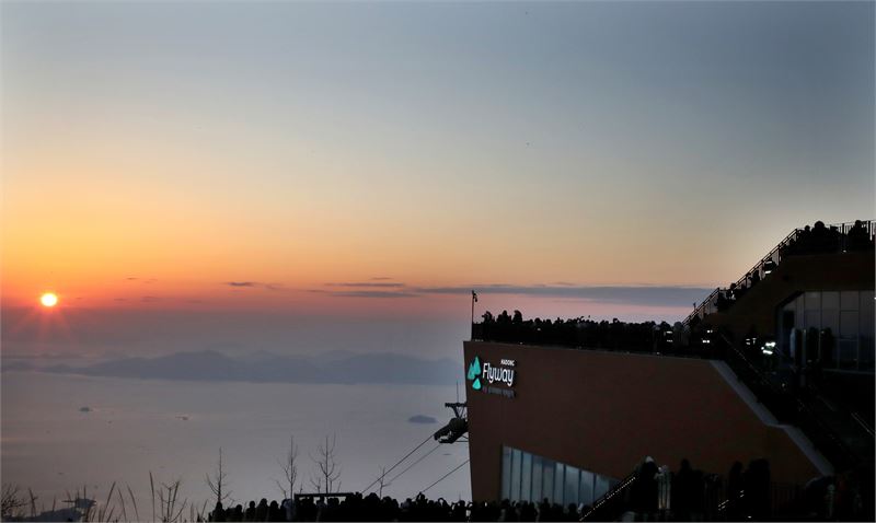 하동 군민과 관광객들이 금오산 정상에서 힘차게 솟는 갑진년 새해 해를 맞이하며 소원을 빌고 있다. 하동군 제공