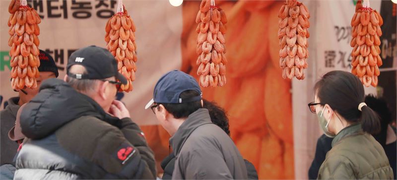 경남 함양 천년의 숲 상림공원 일원에서 열린 ‘제8회 지리산 함양고종시 곶감축제장’을 찾은 방문객들이 곶감 진열대에서 상품을 고르고 있다. 함양군 제공
