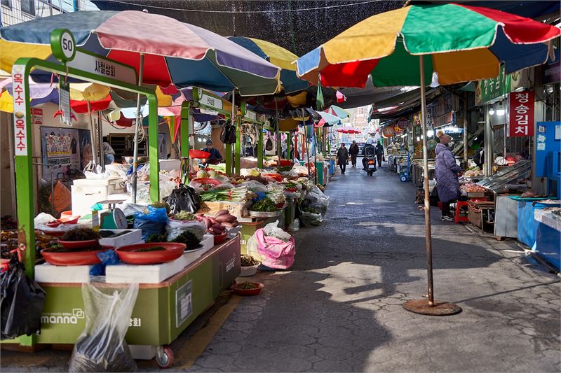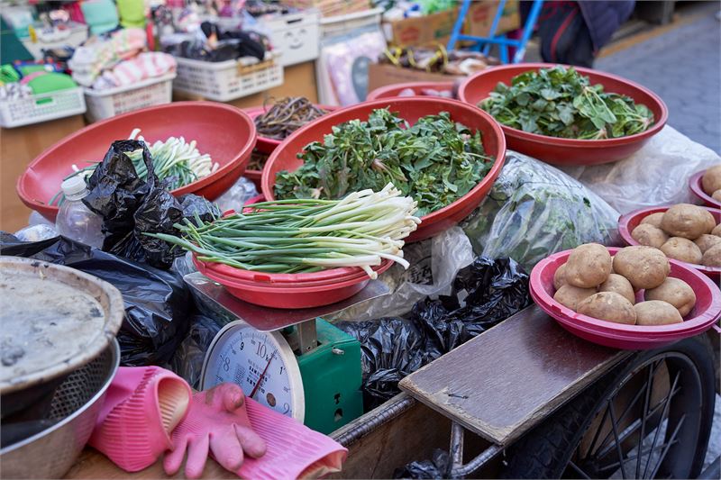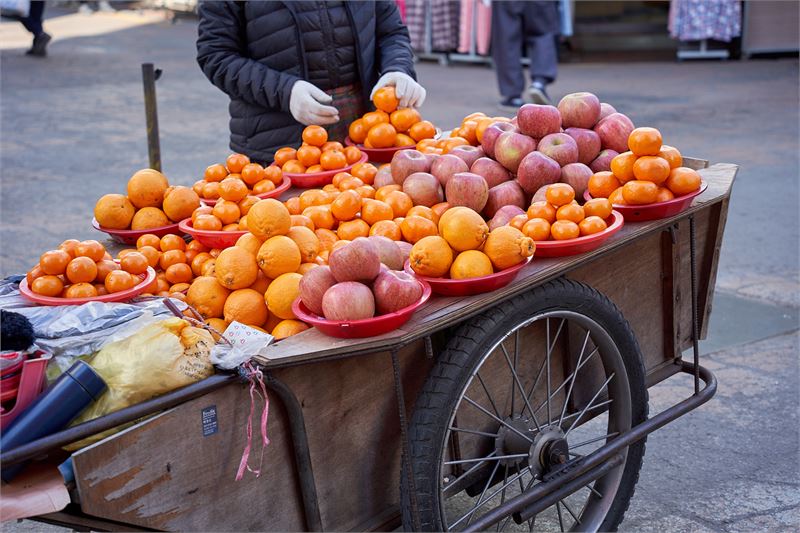 과일이나 채소 등을 싣고 파는 리어카와 시장 구석에 좌판을 깔고 판매하는 모습들입니다.