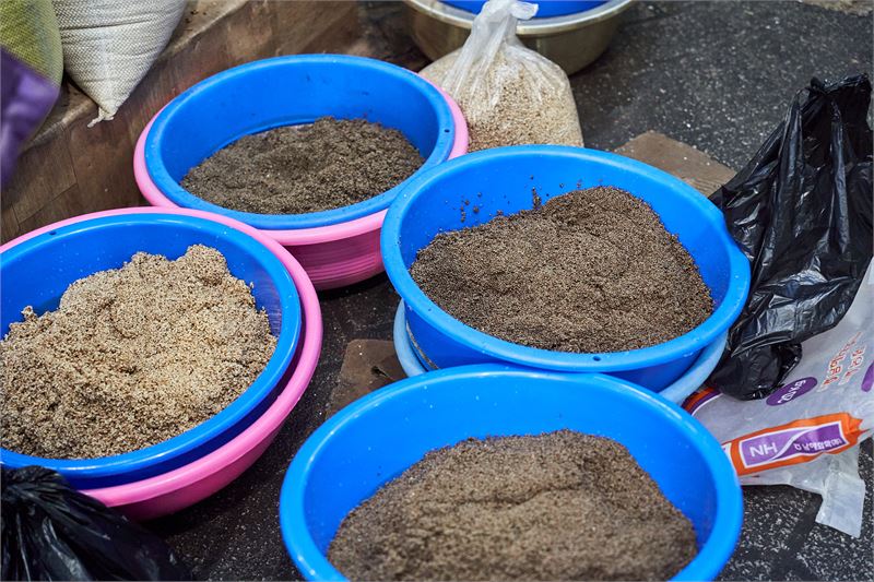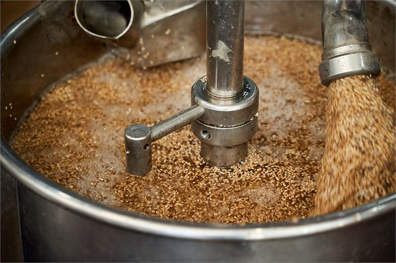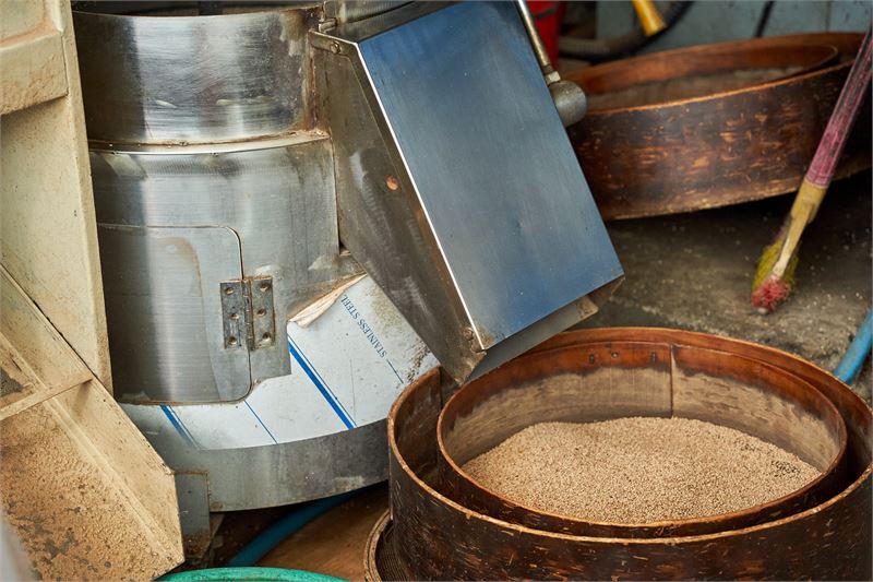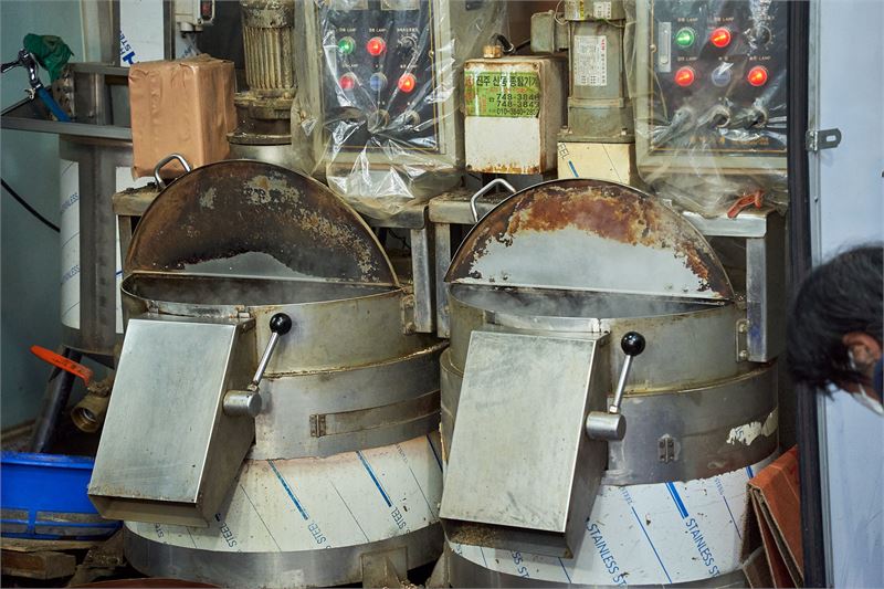 들깨를 볶고 압착기로 눌러 기름을 짜고 있다.