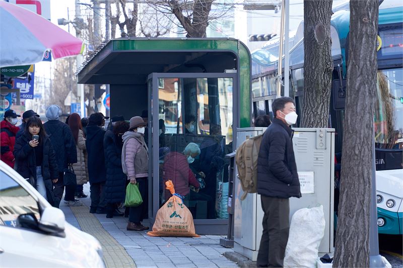 두 시장 근처 버스정류장 모습. 평소와 달리 설을 쇠기 위해 일찌감치 장을 본 뒤 귀가하기 위해 정류장에서 줄을 서 기다리고 있다. 이상 정창현 기자