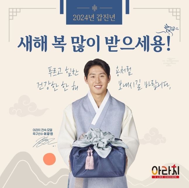 치킨 프랜차이즈 아라치 모델인 이강인이 2004년 새해 인사를 하고 있다. 아라치