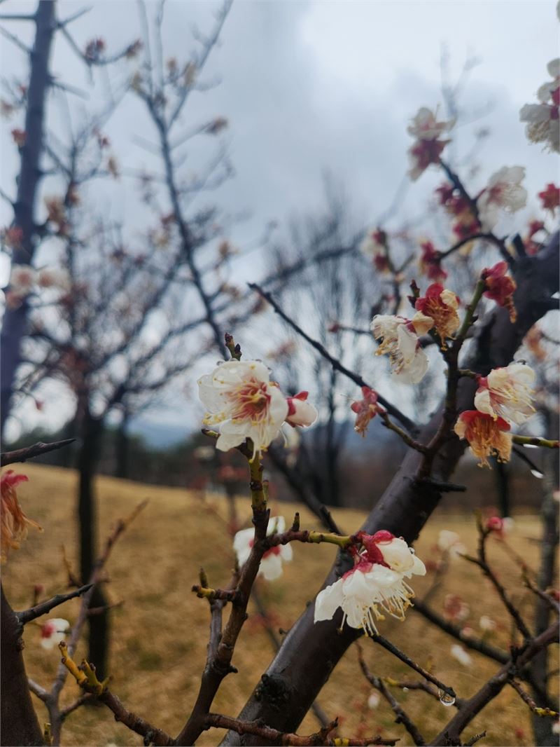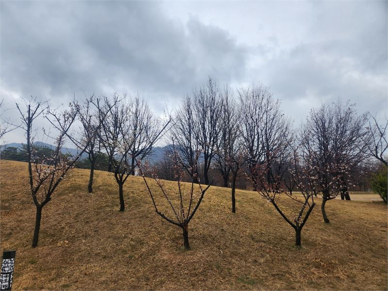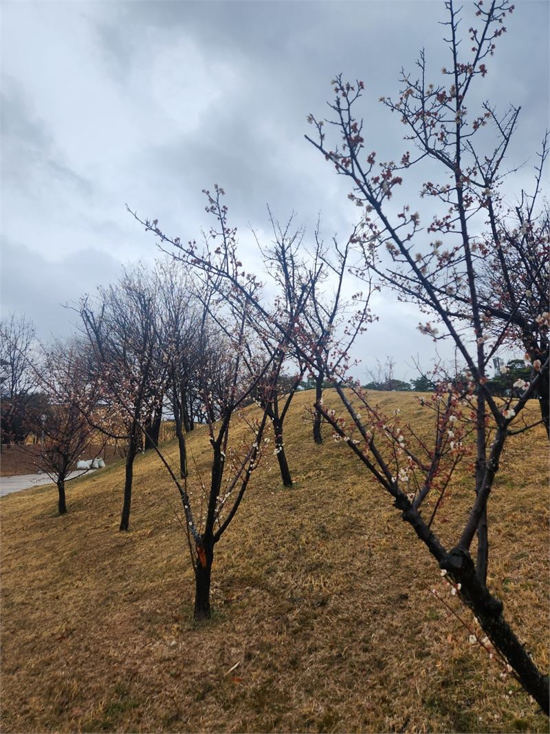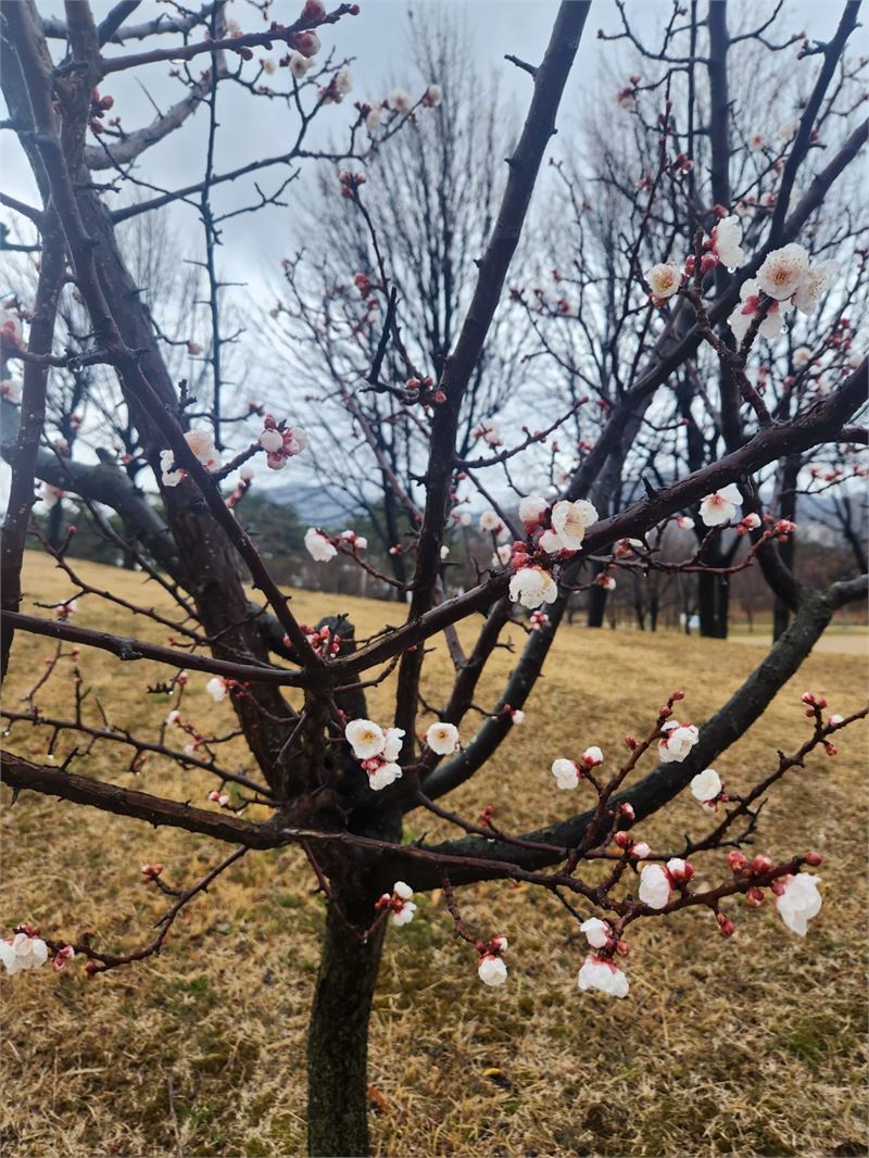 비가 촉촉히 내린 공원 모습. 겨우내 깡말라 있던 공원에 봄기운이 곳곳에서 뭍어난다. 거무튀튀한 나무 가지엔 매화 봉오리와 꽃이 앞다퉈 피어나고 있다.
