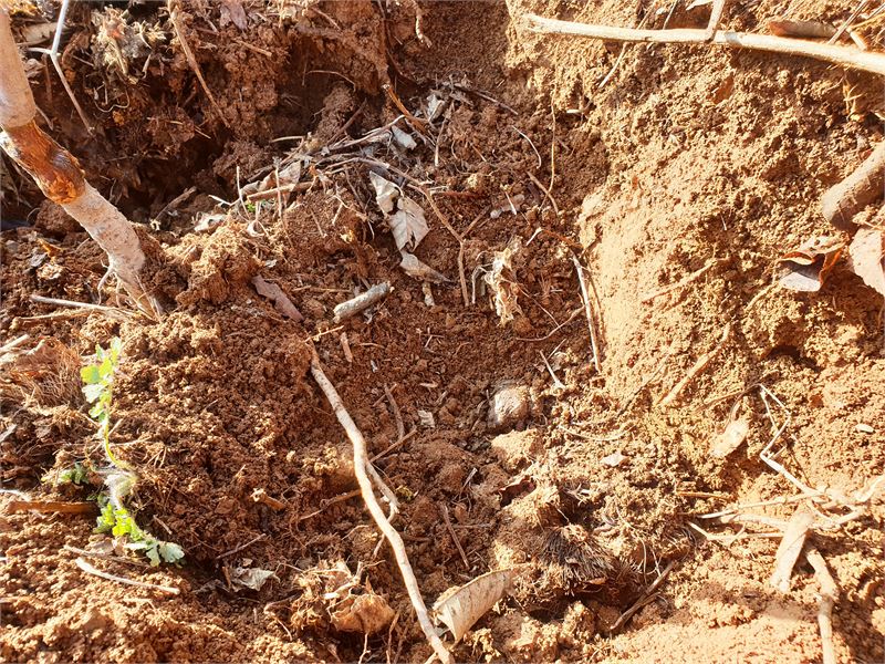나무 묘목 뿌리를 흙으로 덮기 위해 주변 땅을 파다가 나온 개구리 모습(정중앙)
