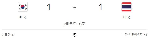 한국이 속한 C조엔 태국·중국·싱가포르가 있으며 한국은 이날 무승부로 조 1위(2승1무·승점 7)를 유지했으나 태국(1승1무1패·승점 4)이 2위, 중국(1승1패·승점 3)은 3위다. 2차 예선에선 조 1~2위 팀이 아시아 최종 예선에 진출한다.