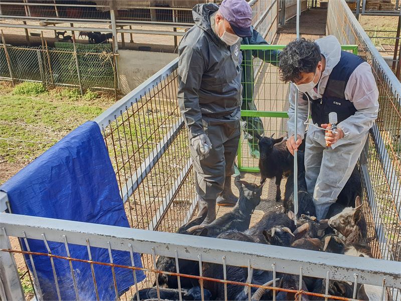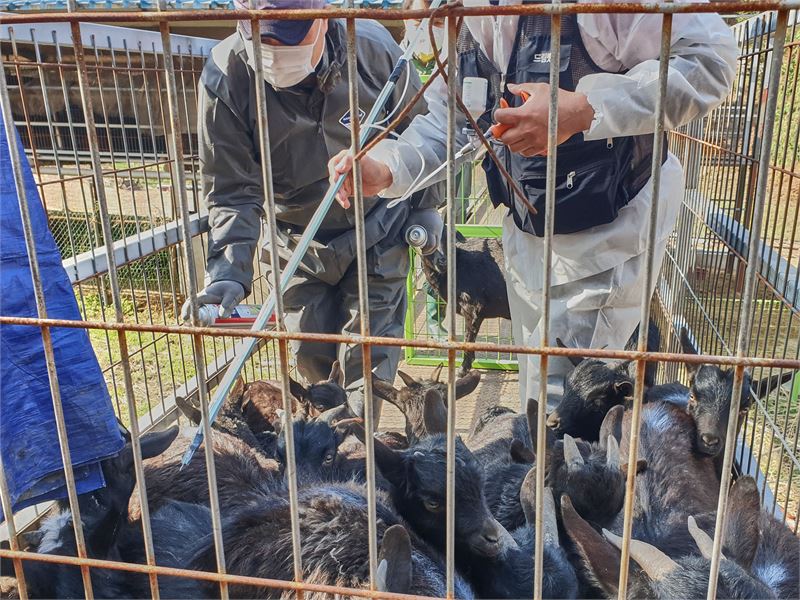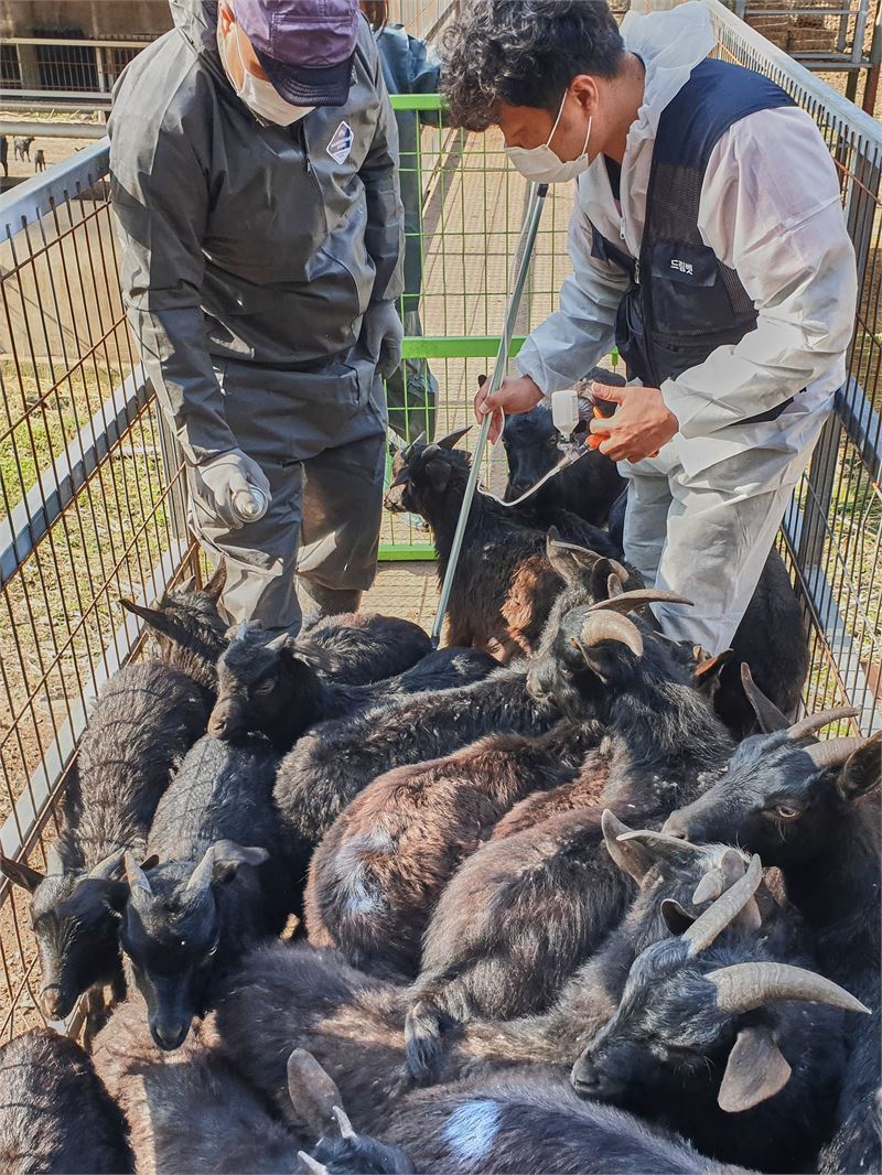 출입구 한쪽으로 흑염소를 몬 뒤 백신 접종을 하는 모습
