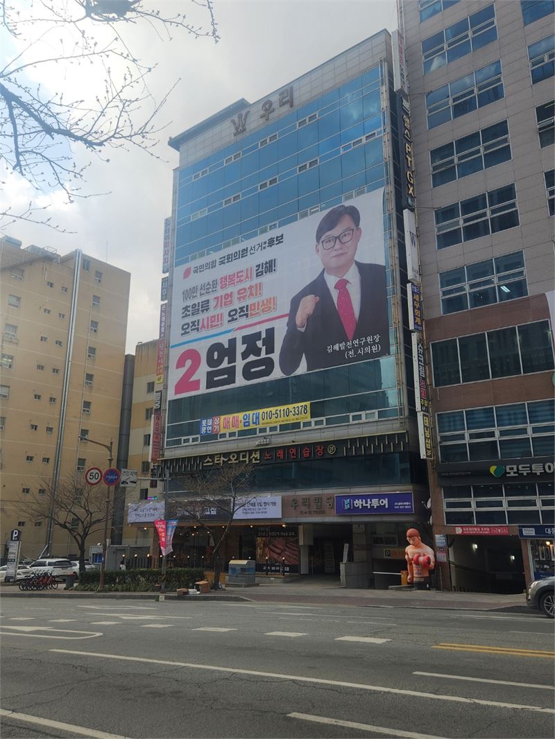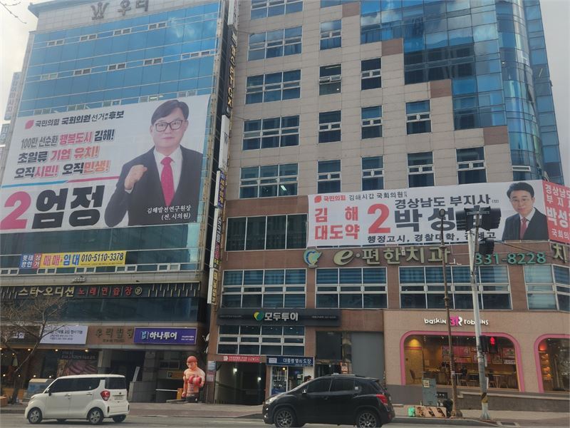 국민의힘 후보 경선 전인 3월 19일 모습. 국민의힘 김해갑 엄정 예비후보(전 김해발전연구원장)와 박성호(전 경남도부지사) 예비후보의 현수막이 걸려 있다.