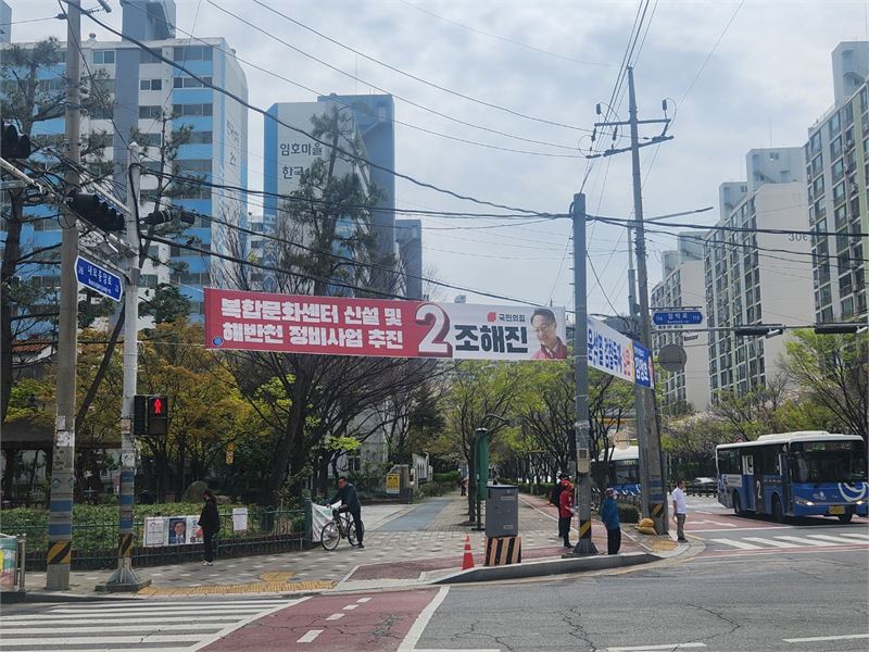 공식 선거운동 기간(3월 28일~4월 9일) 전에는 길거리 현수막에 후보의 이름은 적시하지 못 합니다. 따라서 당의 이름으로 당의 정책만 홍보 가능합니다. 후보나 예비후보 개인의 공약도 현수막에 써넣으면 안 됩니다.