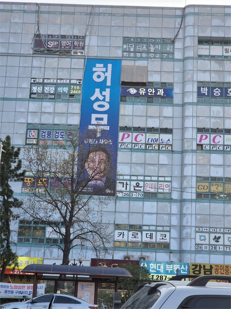 온갖 상호가 있는 건물 벽에 3월 22일 민주당 허성무 예비후보의 현수막이 걸려 있다.