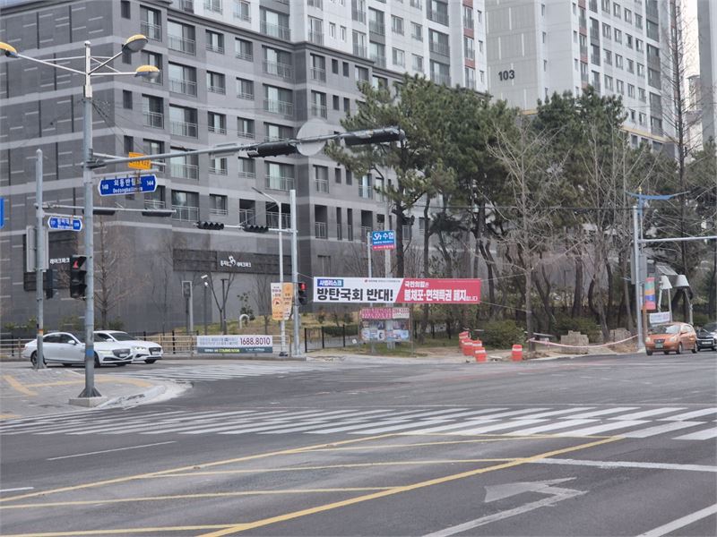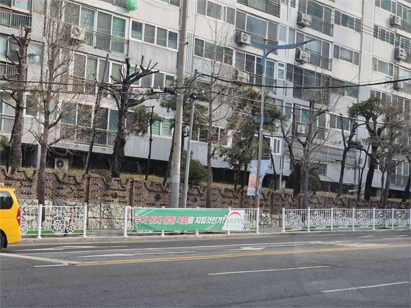 창원시 의창구청 앞 원이대로 변에도 민주당과 국미의힘의 정책 현수막이 걸려 있다.