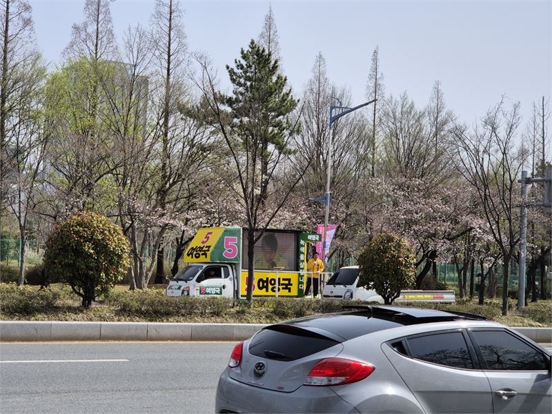 도로가에 녹색정의당 여영국 후보 유세차량이 보인다.