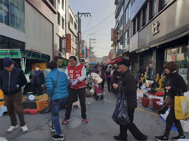 지난 3월 30일 박대출 후보가 지난달 30일 진주 중앙시장 입구에서 지나는 유권자들과 악수를 나누며 지지를 부탁하고 있다. 이하 정창현 기자