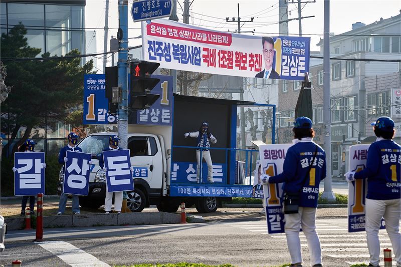 민주당 갈상돈 후보 운동원들이 1일 진주시 인사광장 교차로에서 거리유세를 하고 있다.