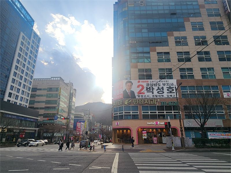 국민의힘 김해갑 경선 전 3월 9일 삼계사거리 모습. 국민의힘 박성호 예비후보 현수막