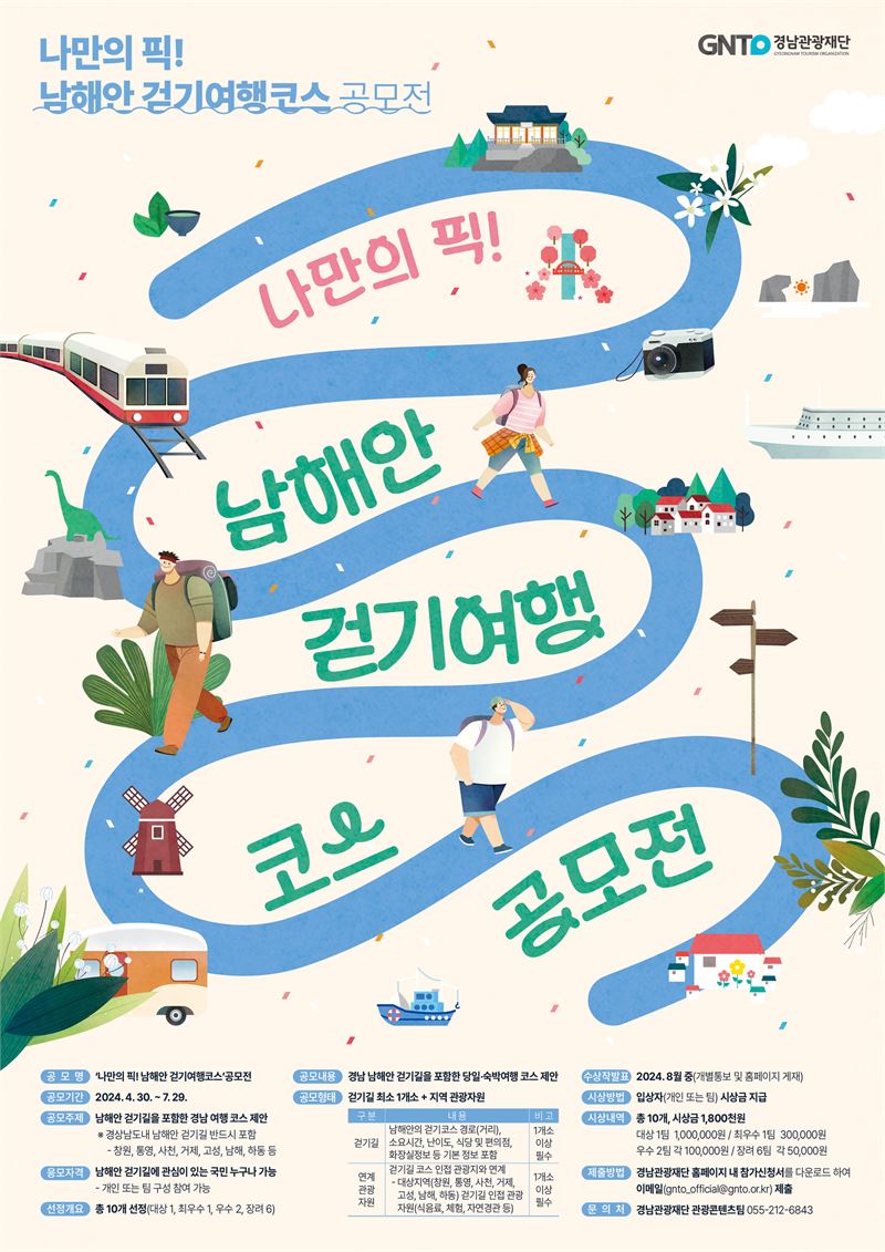 남해안 걷기여행 코스 공모전은 경남 남해안(창원, 통영, 사천, 거제, 고성, 남해, 하동)의 걷기 길과 지역 관광자원을 연계한 당일‧숙박여행 코스 제안을 주제로 한다.
