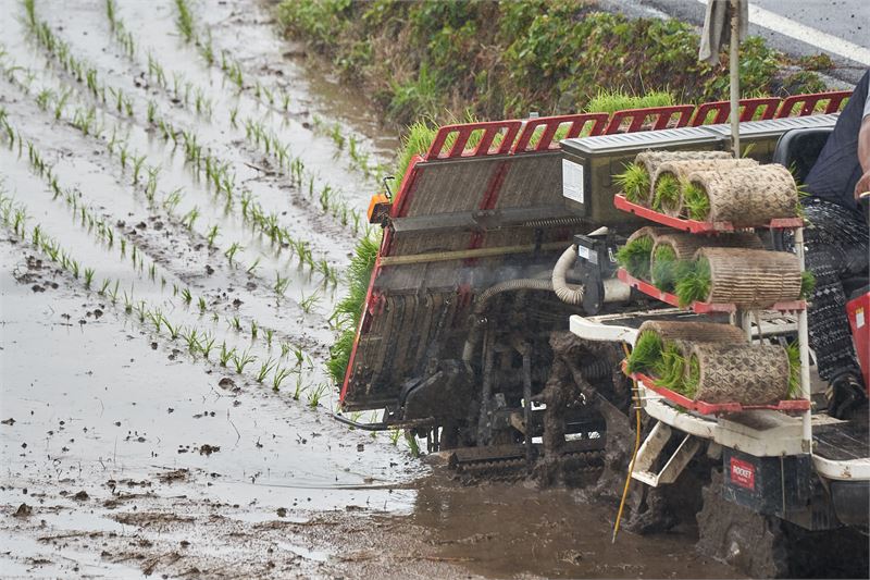 논바닥을 평평하게 고른 뒤 이앙기로 모를 심고 있다. 이상 정창현 기자