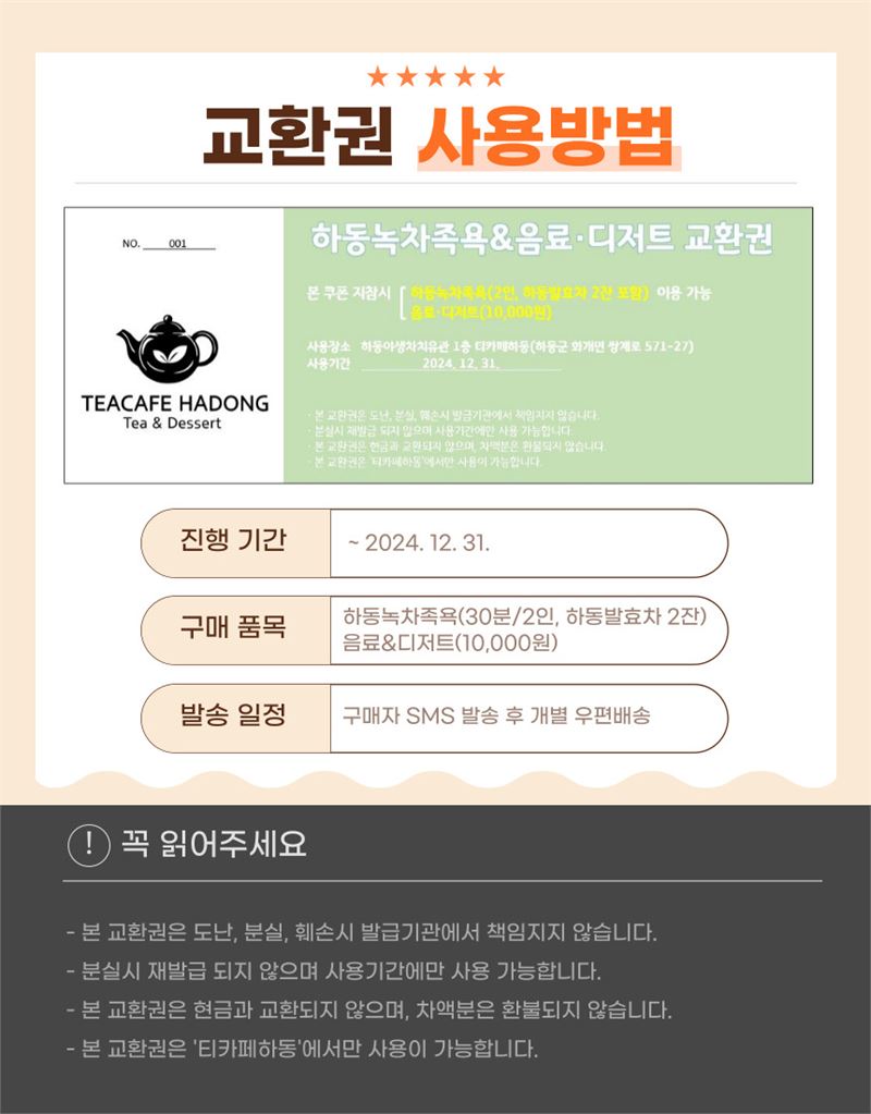 기부자가 답례품을 티카페하동 ‘녹차족욕&음료·디저트 쿠폰’으로 신청하고 전달하고자 하는 지역이나 개인을 지정하면 7일 이내에 등기로 발송된다.