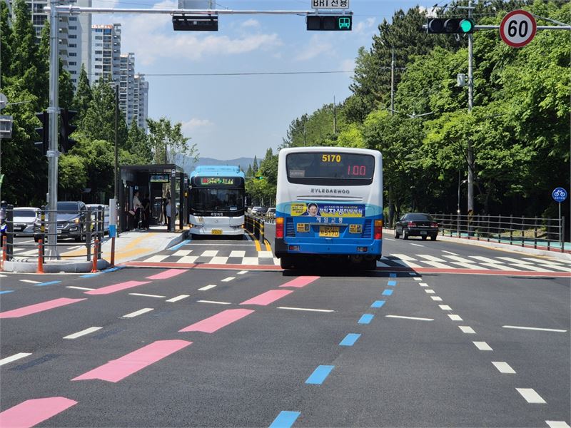 일반버스와 급행버스가 창원시청광장 직전 버스정류장 앞 S-BRT(간선급행버스) 중앙분리대를 사이로 오가고 있다.
