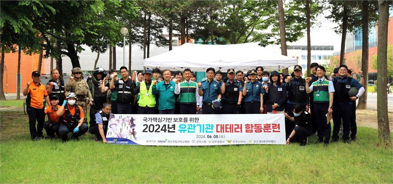 경상국립대병원에서 지난 5일 '유관기관 대테러 합동훈련'을 하고 단체 사진을 찍고 있다. 경상국립대병원