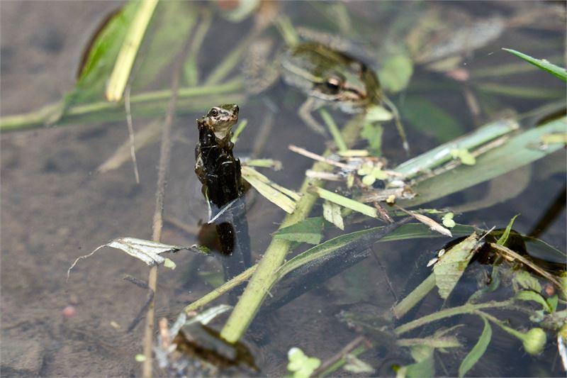 올챙이들이 수초 위에서 얼굴을 내밀고 있는 모습입니다. 올챙이가 아니라 개구리라고 해야겠네요.