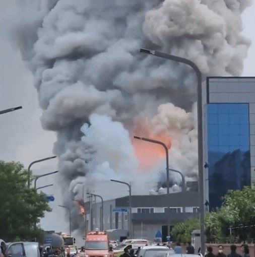 24일 오전 화재 후 폭발로 20여 명의 목숨을 앗아간 경기 화성시 소재 일차전지 업체인 아리셀 공장의 화염 기둥 모습. 엑스(X)