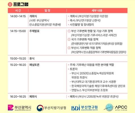 또 한국환경연구원 정휘철 국가기후 위기적응센터장은 '국가 기후변화 적응 정책'을 주제로 제3차 국가 기후위기 적응 강화대책 및 향후 계획을 공유하고, 부산시 권정미 탄소중립정책과 기후변화대응팀장은 '부산시 기후변화 적응 정책'을 주제로 부산의 기후변화로 인한 피해 완화 및 사전 예방을 위한 대책을 소개했다.
