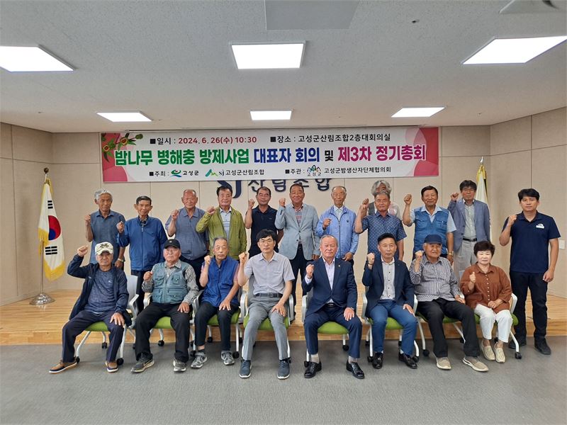 경남 고성군밤생산단체협의회는 26일 오전 고성군 산림조합 2층 대회의실에서 제3차 정기총회를 열고 "밤 농가의 고령화로 방해충 방제를 못한 채 밤 산지가 방치되면서 밤 생산·수집이 점점 줄어드는 등 어려움이 가중되고 있다"며 "근본 대책 마련이 시급하다"고 고성군에 건의했다.