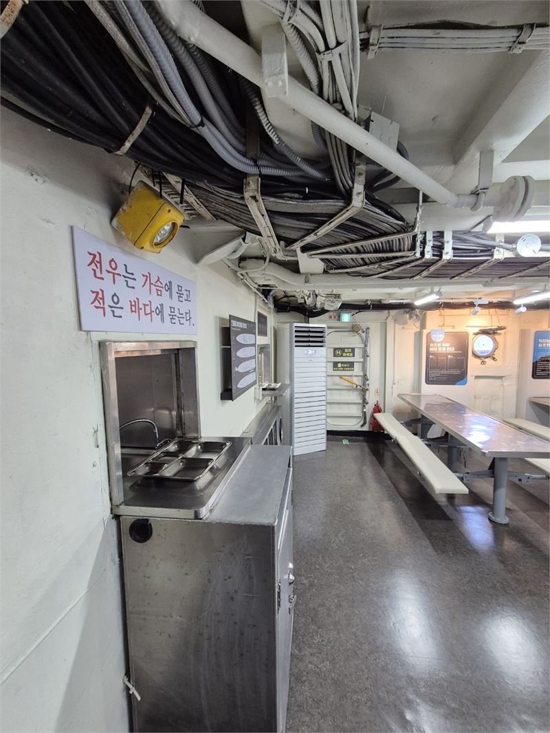 식당 내부 모습. '전우는 가슴에 묻고 적은 바다에 묻는다' 글귀 바로 아내는 조리실에서 식사를 받고 식기를 주는 곳이다.