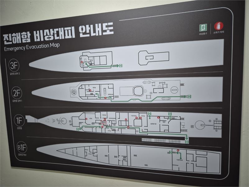 망망대해 바다 생활이기에 비상대피 안내도가 상세히 그려져 있다. 수병들은 수시로 보고 숙지했을 것으로 짐작된다.