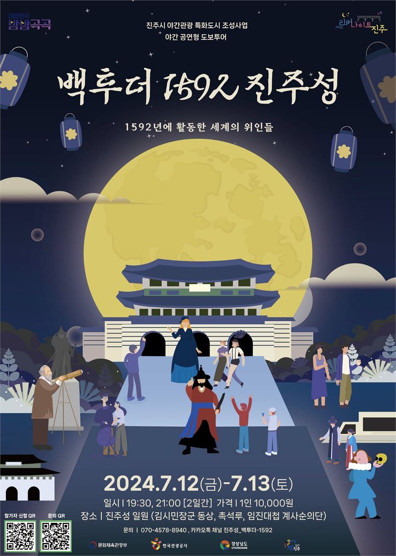 경남 진주시가 7월 2일부터 8월 10일까지 진주성 야경을 배경으로 역사체험극 도보투어 '백투더 1592 진주성' 참가자를 모집한다.