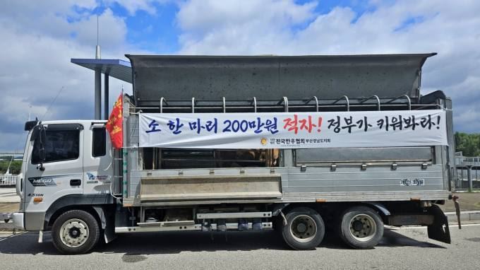 전국한우협회 회원의 소 반납 차량에 ‘정부가 직접 키워보라’는 한우 반납 투쟁 문구가 적혀 있다. 전국한우협회