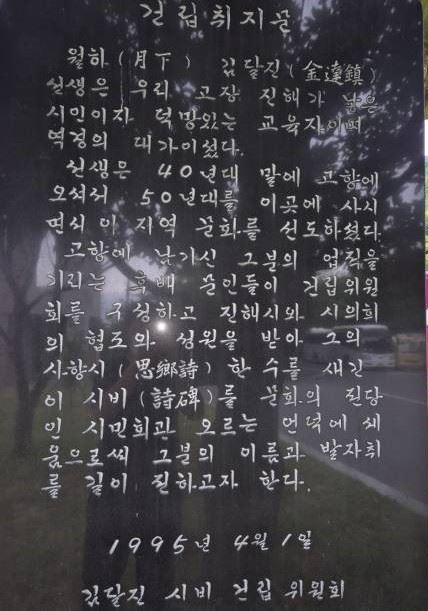 김달진 선생 시비(時碑) 제막 취지문. 시비는 진해 장복산 진해구민회관 바로 밑에 있다.