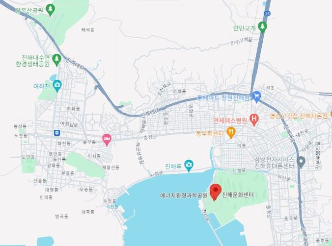 진해문화센터와 에너지환경과학공원(진해야외공연장) 위치도. 왼쪽 위가 장복산 정상이고, 장복산은 진해 앞바다를 보고서 진해 시내를 병풍처럼 둘러싸고 있다. 구글 맵