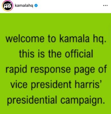 브랫(brat·악동)을 상징하는 '라임 그린'으로 배경색을 바꾼 카멀라 해리스 캠프 측 캠페인 공식 계정. 카멀라 해리스 캠프의 캠페인 인스타그램