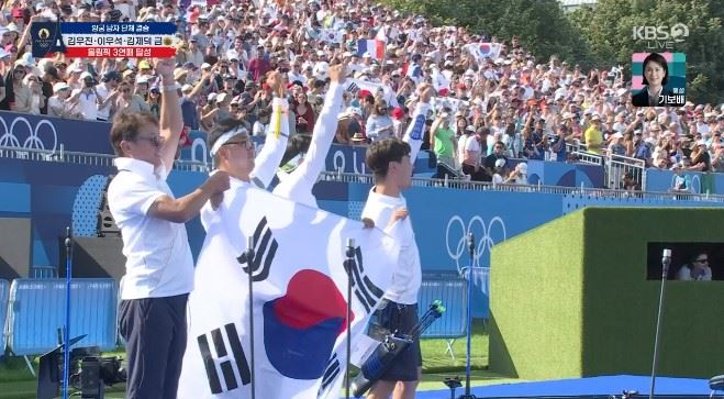 한국 남자 양궁팀이 올림픽 3연패를 한 뒤 태극기를 들고 환호하고 있다. 이상 KBS 중계