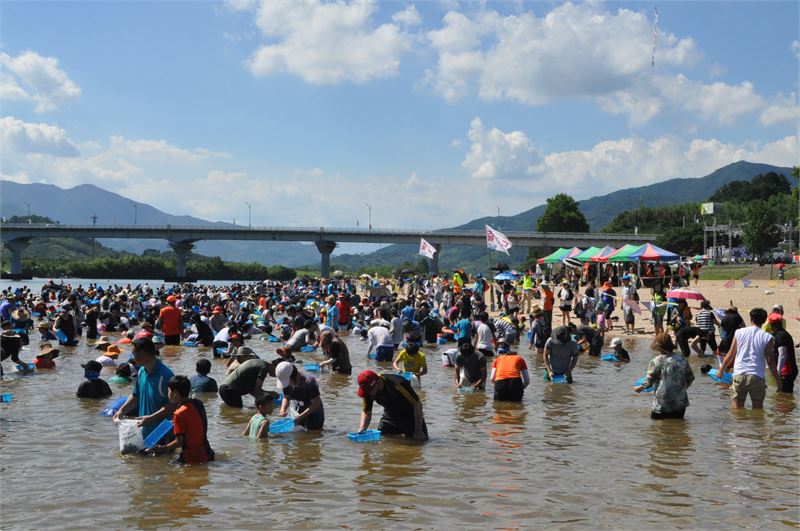 하동섬진강문화재첩축제의 대표 프로그램인 ‘찾아라! 황금재첩’ 행사 참가자들이 섬진강에서 재첩과 황금재첩 모형을 찾기 위해 강으로 뛰어가고 있다.