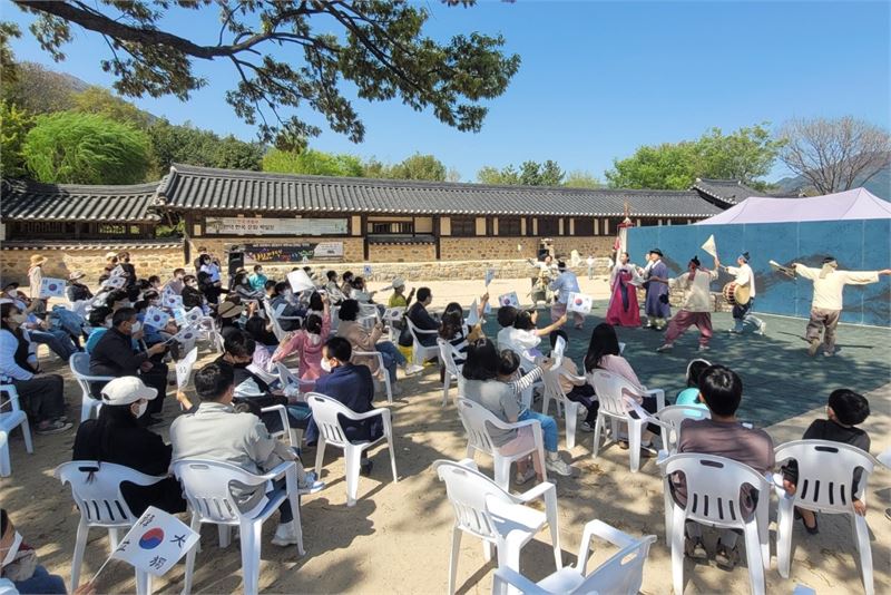 하동군 극단 '큰들'이 2023년 3월 소설 '토지'의 무대인 경남 하동군 악양면 평사리 최참판댁 마당에서 마당극 ‘최참판댁 경사났네’를 공연하고 있다.이상 하동군