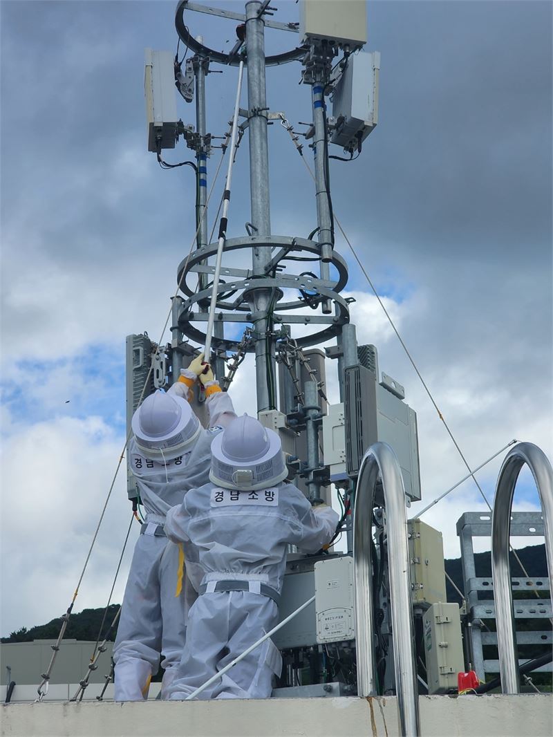 소방대원들이 경남 김해시 한 건물에 설치된 통신 중계기에 지은 벌집을 제거하고 있다. 이상 경남도