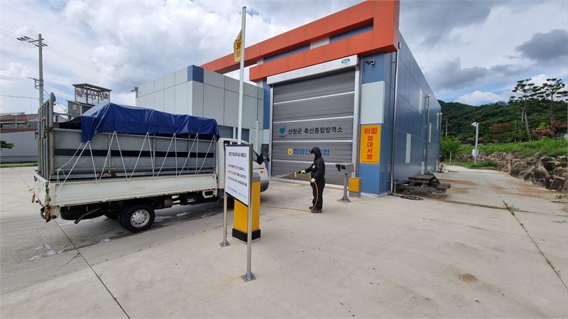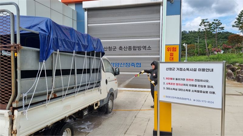 산청군 축산종합방역소 직원이 양돈농가 등을 출입하는 차량에 방역소독을 하고 있다.