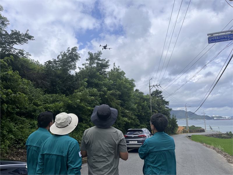 남해군 관계자들이 폭염 대책으로 드론을 띄워 논밭 등에서의 온열질환자를 찾는 시범을 보이고 있다. 남해군
