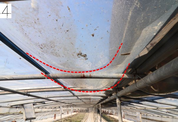 비닐하우스 위쪽에 물이 고여 태양광 돋보기 효과로 화재가 발생할 수 있다. 경남도