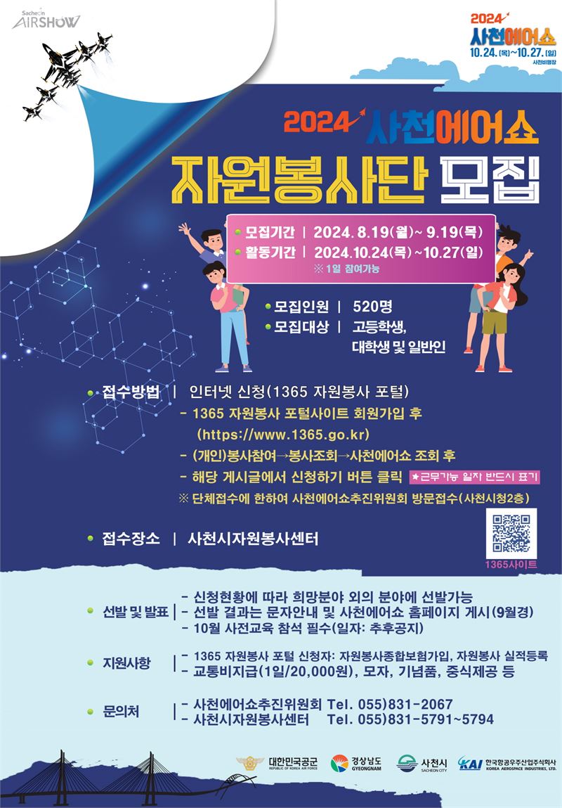 경남 사천에어쇼 추진위원회는 ‘2024 사천에어쇼’의 행사장 질서 유지 및 관람객 안전과 편의 제공 등을 위해 오는 9월 19일까지 자원봉사자 500명을 추가 모집한다고 16일 밝혔다.