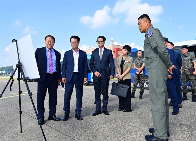 13일 공군 제3훈련비행단이 마련한 사천에어쇼 준비 행사에서 참석자들이 행사 내용 설명을 듣고 있다.