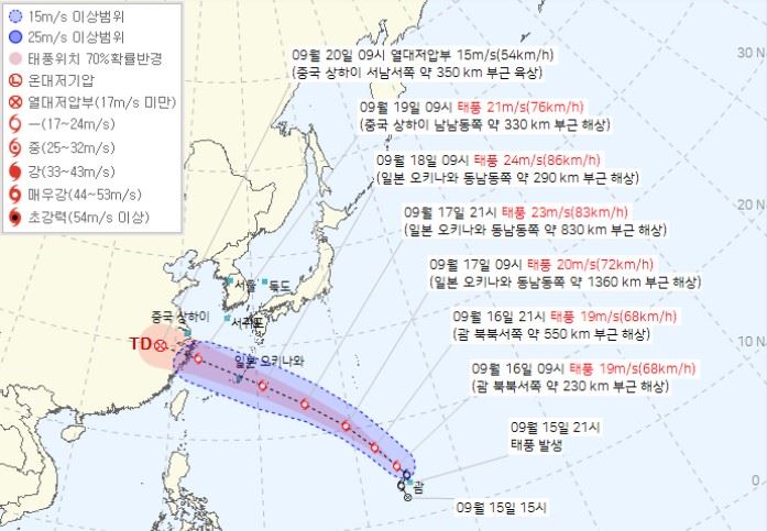 18일 오전 일본 오키나와 동남동쪽 약 290km 부근 해상까지 접근하고, 19~20일에는 중국 상하이 서남서쪽 해안을 통해 상륙할 것으로 전망된다.